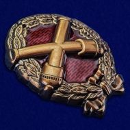Значок отлит на высококачественном оборудовании. Он сделан из латуни золотистого цвета. Форма овальная, основа сделана из венка, правая половина которого сплетена из дубовых ветвей, левая из лавровых. Листья украшены небольшим количеством чернения. В нижней части венок перевязан большим бантом. Центр фона окрашен красной эмалью с узором в виде небольших стилизованных полосок, имитирующих кирпичную кладку. Поверх них наложены два скрещенных ствола артиллерийских орудий выпуклой формы. Высота знака составляет 4,5 см, ширина 3,3 см. На реверсе имеется крепление в виде закрутки для ношения на одежде.